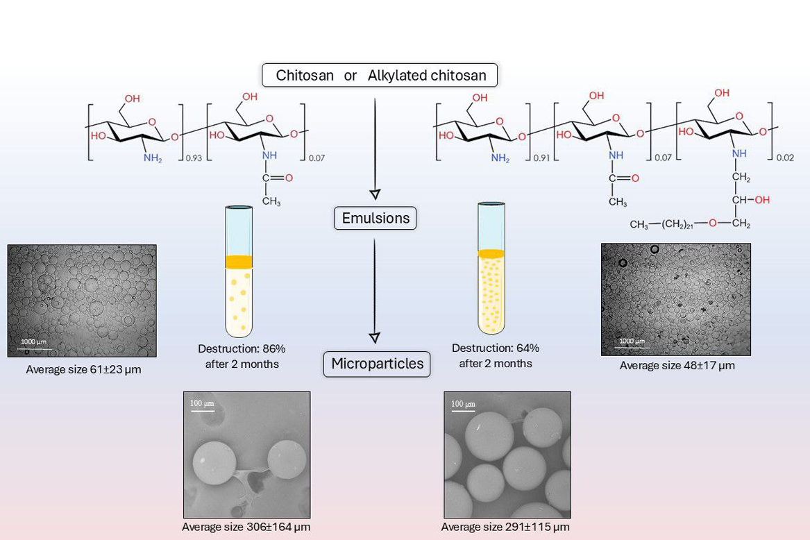Коллектив ученых Курчатовского комплекса кристаллографии и фотоники НИЦ «Курчатовский институт» в соавторстве с коллегами из Института Синтетических Полимерных Материалов РАН, Московского авиационного института, Сеченовского института исследовали хитозан и его алкилированное производное в качестве эмульгатора и стабилизатора для продления срока жизни эмульсий масло/вода и для получения материалов с использованием эмульсионных технологий. Модифицирование хитозана позволяет существенно улучшить его эмульгирующие и стабилизирующие свойства по сравнению с исходным хитозаном: выше вязкость, ниже ГЛБ и поверхностное натяжение. Такие эмульсии имели меньший средний размер капель дисперсной фазы и были более устойчивы к коалесценции.
