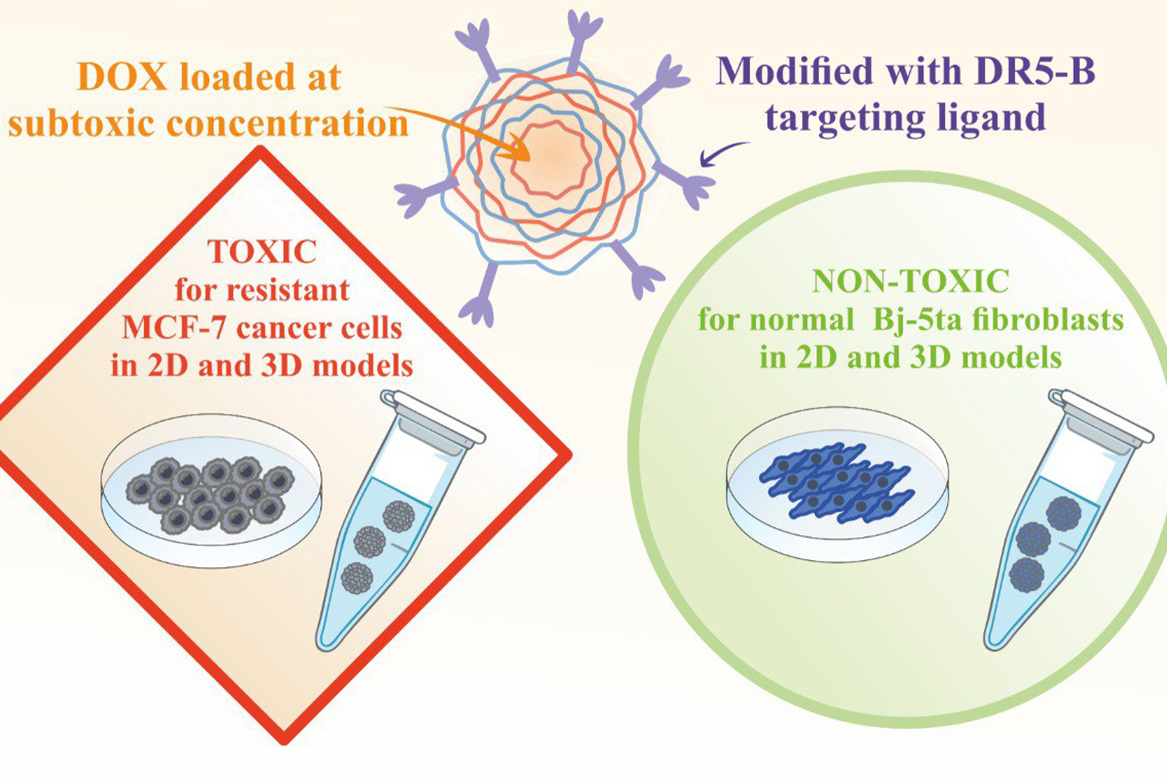 Благодаря тепловому «сжатию» капсулы стали ультракомпактными (~320 нм) и эффективно проникают в трёхмерные опухолевые сфероиды, модулирующие реальную структуру опухоли. Капсулы несут два компонента: внутри - химиопрепарат доксорубицин в субтоксичной дозе, снаружи - белок DR50B, избирательно активирующий рецептор гибели раковых клеток.